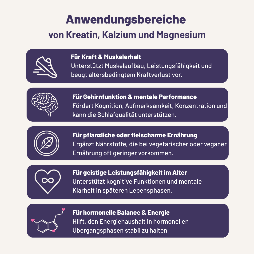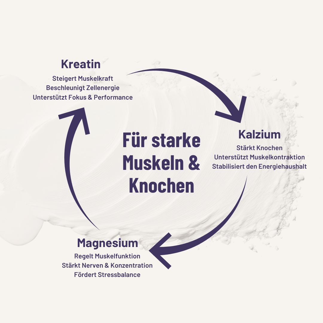 • Calcium & Magnesium sind zusätzlich wichtig, da sie eine zentrale Rolle im Energiestoffwechsel, in der Muskelkontraktion sowie in der Weiterleitung von Nervenimpulsen spielen. In Kombination mit Kreatin unterstützen sie eine optimale Leistungsfähigkeit, eine bessere Regeneration und einen ausgeglichenen Mineralstoffhaushalt – besonders bei sportlich aktiven Menschen.